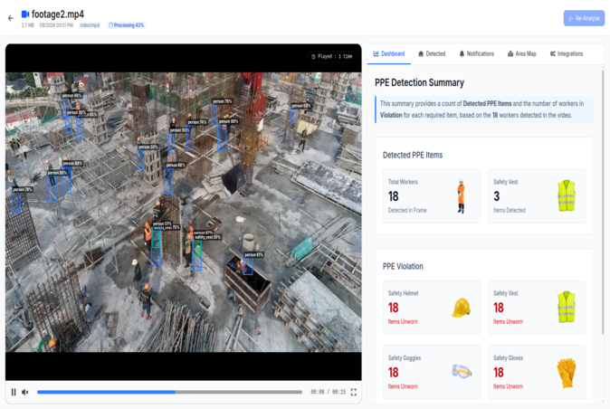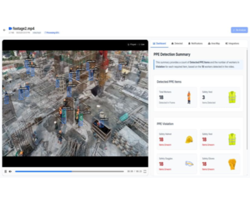 AI-powered system that detects helmets, vests, gloves, and masks in real time—ensuring workforce safety and compliance across hazardous environments.